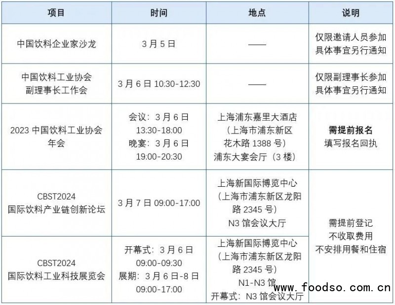 經(jīng)研究決定,2023中國相關(guān)食品資訊中國飲料相關(guān)食品資訊飲料工業(yè)協(xié)會年會、CBST2024國際飲料工業(yè)科技展覽會等系列活動將于3月6日~8日在上海舉行。