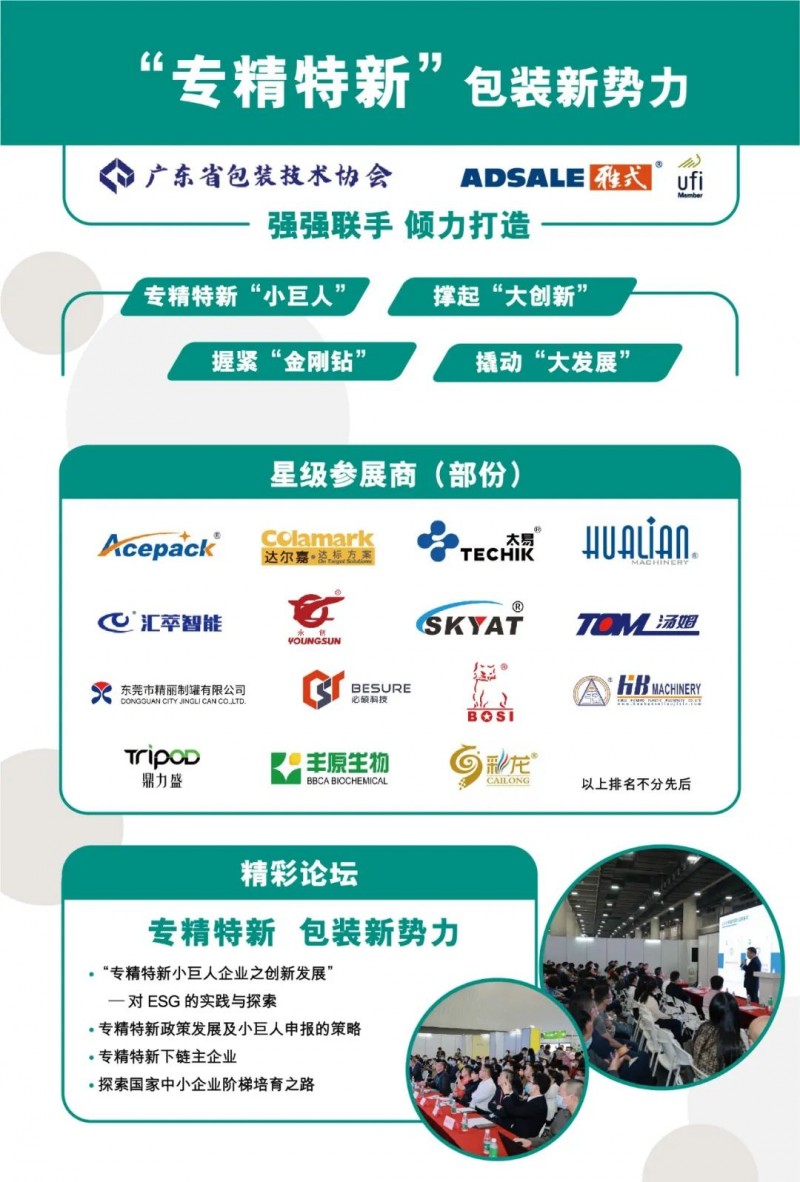 此外,2024Sino-Pack/PACKINNO華南包裝展與廣東省包裝技術(shù)協(xié)會攜手合作,共同打造“專精特新包裝新勢力”,展會將深度探索包裝行業(yè)中那些專注、精細(xì)、特色、創(chuàng)新的小巨人企業(yè),邀請它們亮相展會,發(fā)布新產(chǎn)品,并提供專業(yè)化、精細(xì)化、特色化、創(chuàng)新性的包裝解決方案。同時,還將解析行業(yè)趨勢、新技術(shù)和國家利好政策,為品牌商和包裝生產(chǎn)商提供一站式的解決方案。這將幫助他們解決目前生產(chǎn)中的難點和痛點,加速生產(chǎn)方式的轉(zhuǎn)變和轉(zhuǎn)型升級,降低成本,提高核心競爭力。