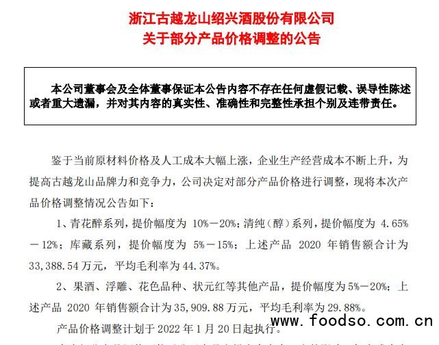 具體來(lái)看,公告稱(chēng),鑒于當(dāng)前原材料價(jià)格及人工成本大幅上漲,企業(yè)生產(chǎn)經(jīng)營(yíng)成本不斷上升,為提高古越龍山品牌力和競(jìng)爭(zhēng)力,公司決定對(duì)部分產(chǎn)品價(jià)格進(jìn)行調(diào)整。
