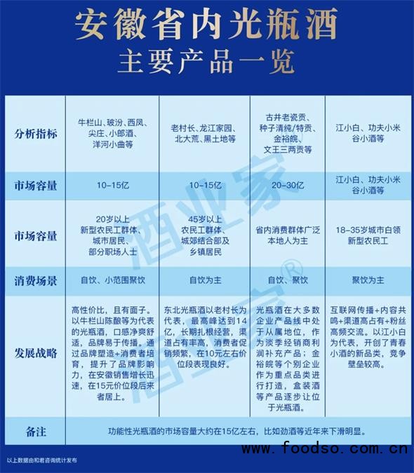 目前安徽主流的光瓶酒品牌主要有四類:第一類,全國(guó)性名酒的光瓶酒品牌,如牛欄山、波汾、西鳳、五糧液尖莊、瀘州二曲、小郎酒、洋河小曲等;第二類,東北光瓶酒陣營(yíng),如老村長(zhǎng)、龍江家園等;第三類,徽酒五朵金花出產(chǎn)的古井老瓷貢、種子清純等優(yōu)質(zhì)產(chǎn)品,以及本地中小酒廠在根據(jù)地市場(chǎng)布局的光瓶酒品牌,如金裕皖、種子特貢、文王三兩貢、古漕運(yùn)兼香二鍋頭等;第四類:小清新文化類光瓶酒,如江小白、功夫小米、谷小酒等。