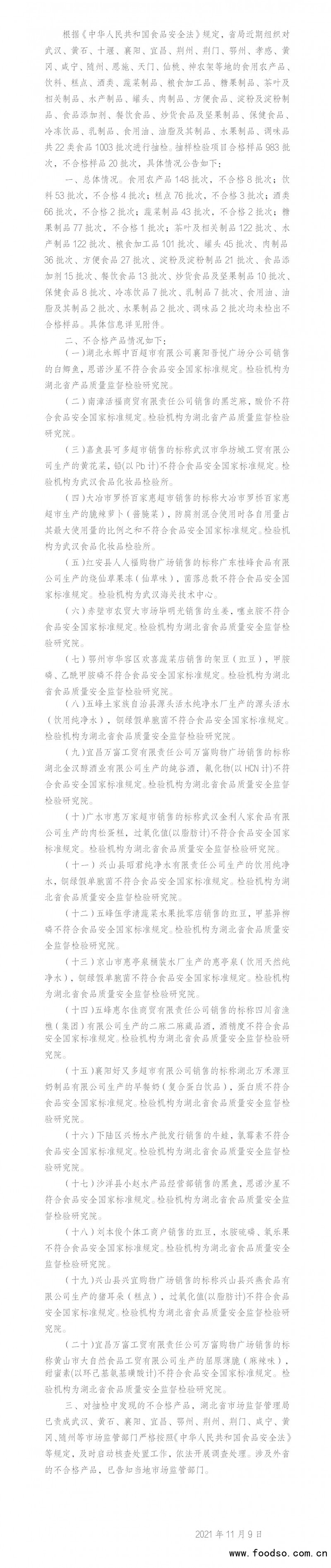 湖北省市場(chǎng)監(jiān)督管理局 食品安全監(jiān)督抽檢信息公告(2021年第17期)
