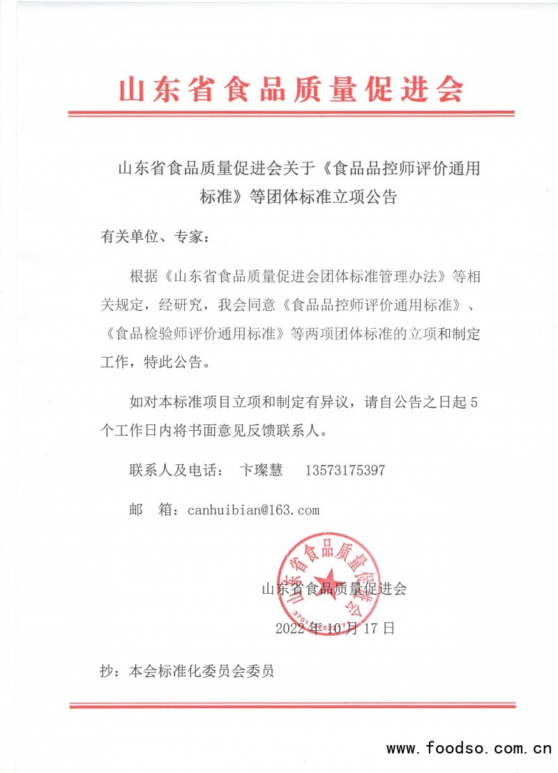 山東省食品質(zhì)量促進(jìn)會(huì)關(guān)于《食品品控師評(píng)價(jià)通用標(biāo)準(zhǔn)》等團(tuán)體標(biāo)準(zhǔn)立項(xiàng)公告