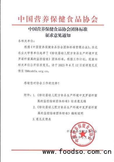 根據(jù)《中國營養(yǎng)保健食品協(xié)會團體標準管理相關(guān)食品資訊管理辦法》,東北農(nóng)業(yè)大學(xué)等單位起草了《粉狀嬰幼兒配方食品相關(guān)食品資訊嬰幼兒配方食品生產(chǎn)環(huán)境中克羅諾桿菌屬的監(jiān)控指南》團體標準,根據(jù)工作計劃,現(xiàn)面向相關(guān)單位公開征求意見,請于2023年6月12日前將意見反饋至TB@cnhfa.org.cn。