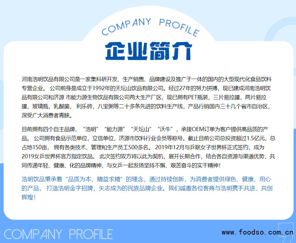 公司前身是成立于1992年的天壇山飲品有限公司。經(jīng)過27年的努力拼搏,現(xiàn)已建成河南浩明飲品有限公司和濟(jì)源市能力源生物飲品有限公司兩大生產(chǎn)廠區(qū),現(xiàn)已擁有PET瓶裝,三片易拉罐,兩片易拉罐,玻璃瓶,乳酸菌,利樂磚,八寶粥等二十多條先進(jìn)的飲料生產(chǎn)線,產(chǎn)品行銷國內(nèi)三十幾個(gè)省市自治區(qū),深受廣大消費(fèi)者青睞。目前擁有四個(gè)自主品牌,“浩明”“能力源”“天壇山”“沃牛”,同時(shí)為客戶提供私人訂制服務(wù),并承接OEM訂單為客戶提供高品質(zhì)的產(chǎn)品。公司擁有食品示范單位,立信單位,濟(jì)源市飲料行業(yè)會(huì)員等稱號。截止目前公司總投資超過1.5億元,總占地150畝,擁有各類技術(shù)、管理和生產(chǎn)員工500多名。2019年12月與乒聯(lián)女子世界杯正式簽約,成為2019女乒世界杯官方指定飲品。此次簽約雙方將以此為契機(jī),展開長期合作,結(jié)合各自資源與渠道優(yōu)勢,共同傳遞年輕、健康、化的品牌精神,與女乒一起發(fā)揚(yáng)堅(jiān)持不懈、艱苦奮斗的實(shí)干精神!