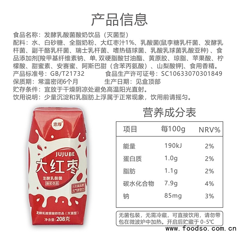 忠厚乳業(yè)大紅棗發(fā)酵乳酸菌酸奶飲品208g盒是由湖北忠厚乳業(yè)集團(tuán)有限公司經(jīng)營的植物蛋白飲料系列產(chǎn)品,忠厚乳業(yè)大紅棗發(fā)酵乳酸菌酸奶飲品契合廣大消費(fèi)者需求,口味純正,賦予您豐富的營養(yǎng)和口感。公司始終堅(jiān)持以健康的產(chǎn)品,過硬的質(zhì)量,貼心的服務(wù),合理的價(jià)格和秉承雙贏的經(jīng)營理念,現(xiàn)面向全國誠招代理商,歡迎來電咨詢!